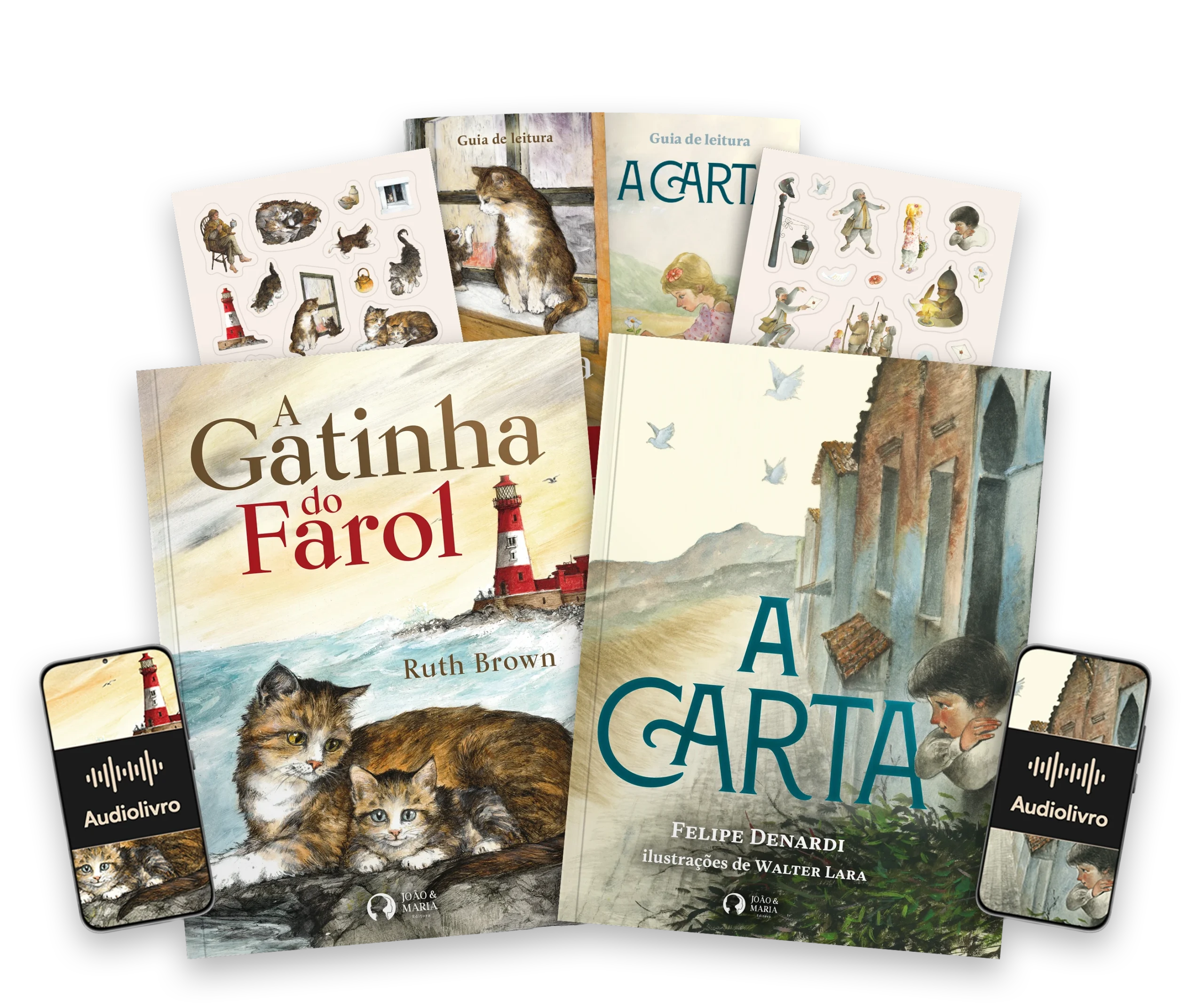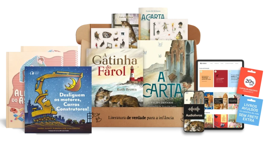 Nossos assinantes recebem em casa todos os meses, ao longo de um ano, uma caixinha contendo um livro de literatura infantil e um guia de leitura, além de acesso à Casa do Assinante – um portal personalizado onde se encontram nossos audiolivros (incluindo o do lançamento do mês) e cursos de formação, além de outros benefícios.
