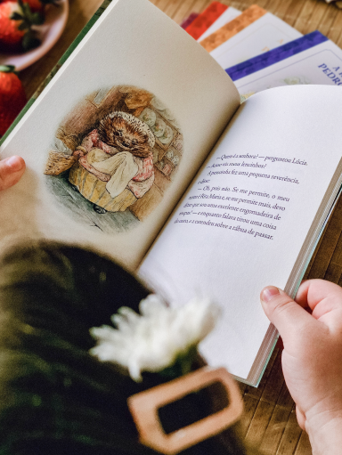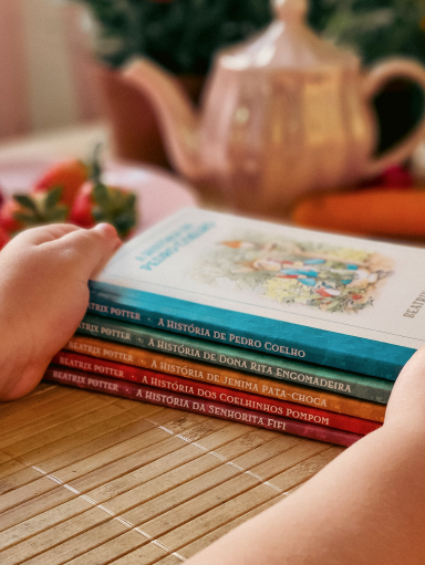 Os livros seguem o formato original criado por Beatrix Potter: pequenos sem serem minúsculos, do tamanho ideal para caber nas mãos das crianças — o que deixa tudo ainda mais mágico para os pequenos leitores.